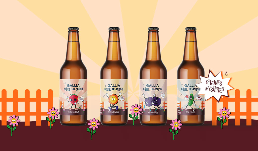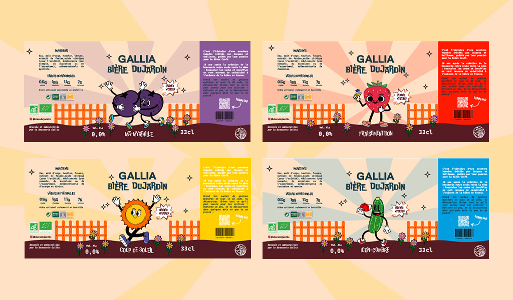 « Bière du jardin » est une collection de bières d’été sans alcool créée en partenariat avec Gallia, mettant en avant des fruits d’été frais provenant du jardin. Pour ce projet, j’ai été en charge de la création de l’identité graphique de la collection. J’ai choisi d’utiliser un style rétro, enfantin et festif pour refléter l’idée que cette boisson est accessible à tous.